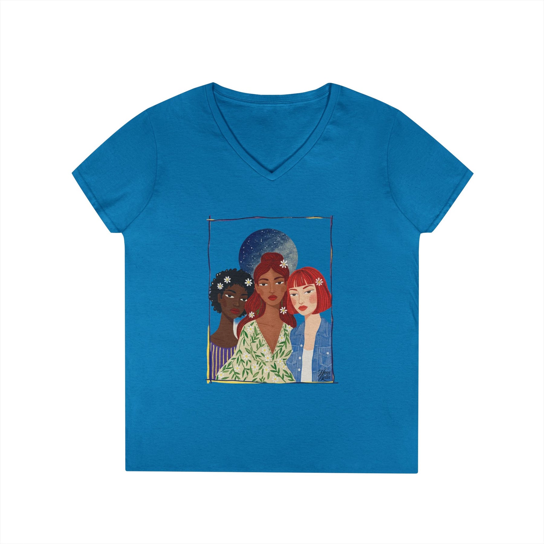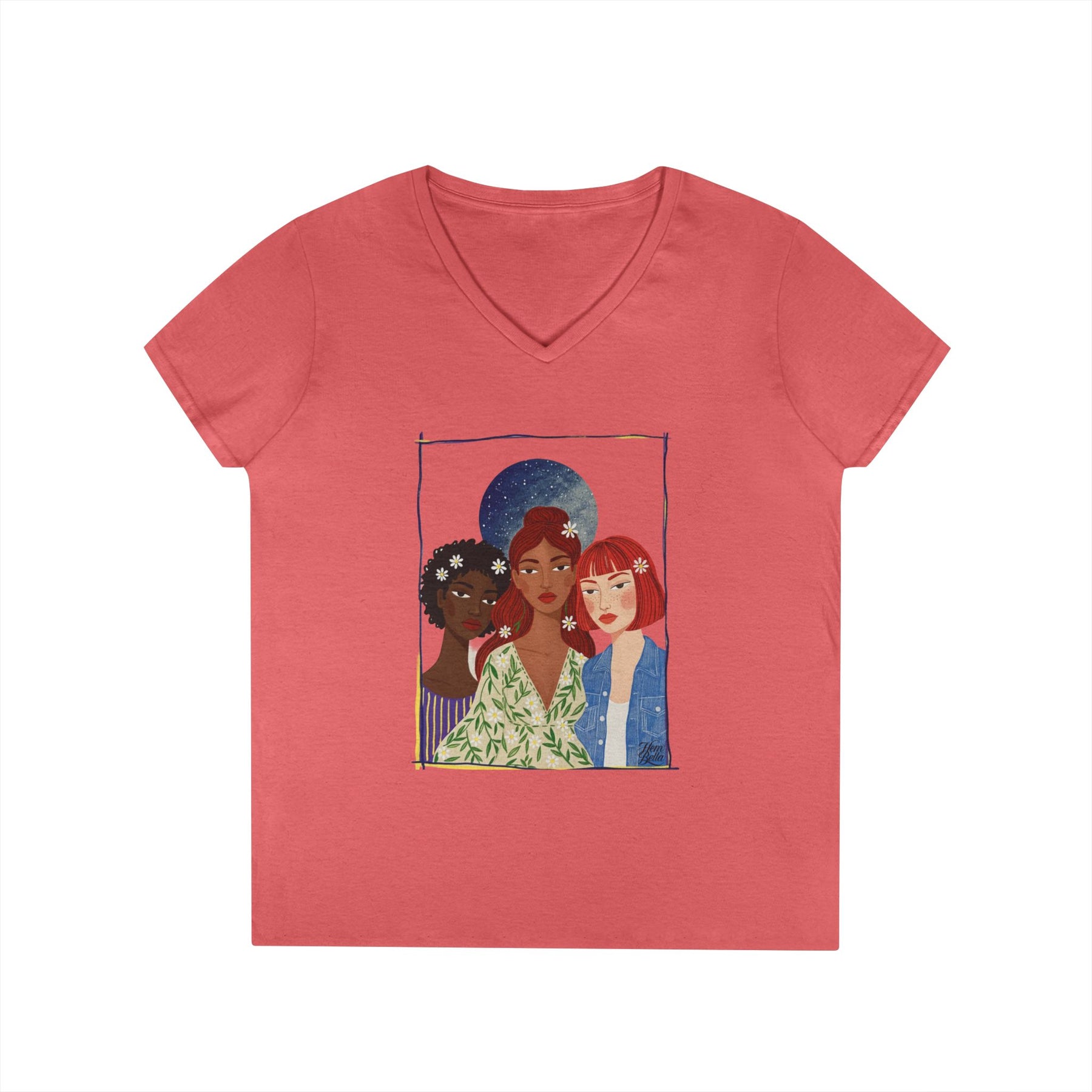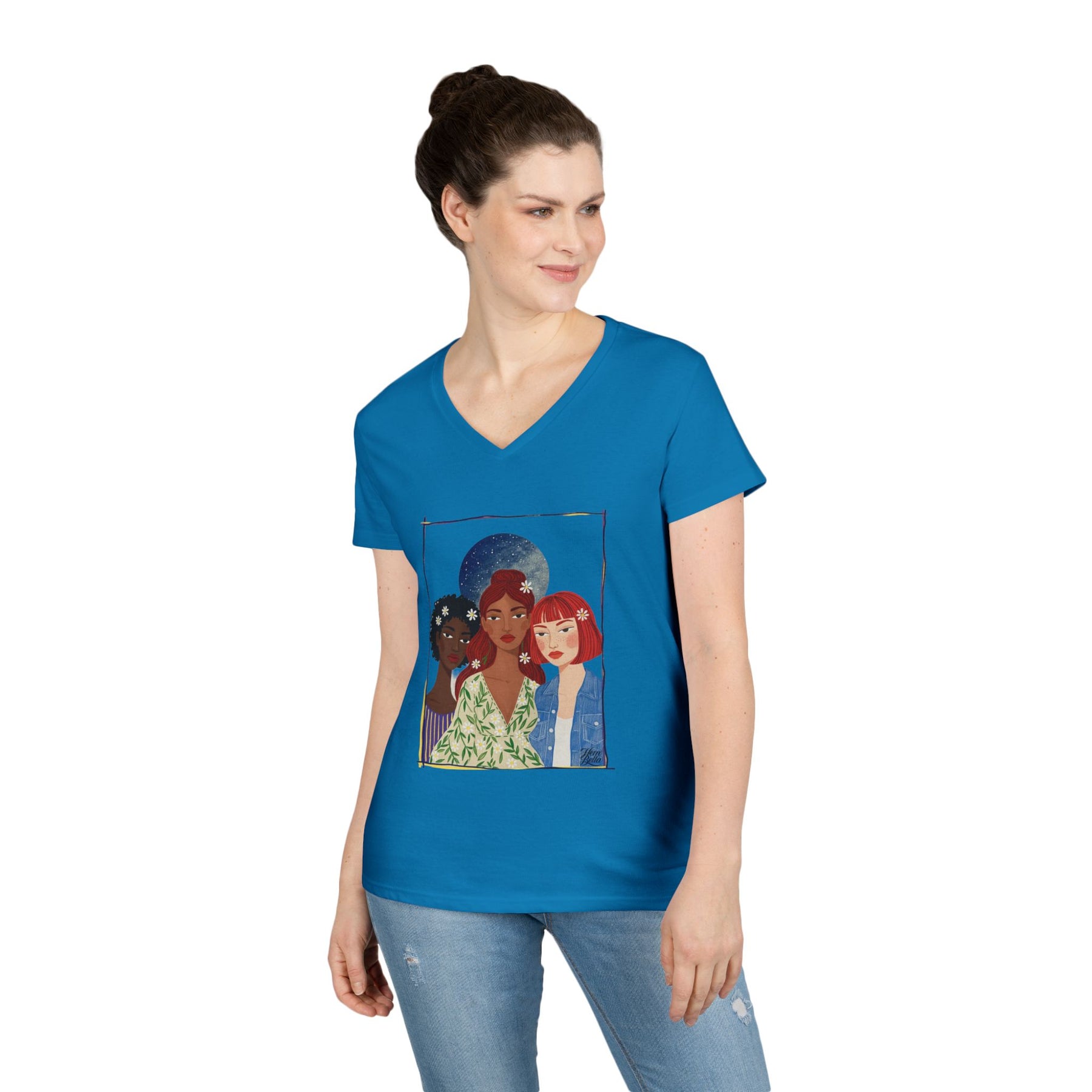 Light, thoughtful, and quietly bold — this V-neck tee celebrates friendship and shared strength. A soft white canvas showcases an intimate illustration of three women standing close: different skin tones, styles, and stories woven together beneath a faded moon. Wear it on mornings when you want a gentle reminder of chosen family, or layered under a jacket for evenings that call for a soft, meaningful statement. The semi-fitted cut and medium-weight cotton sit comfortably between relaxed and shaped, moving with you through errands, coffee dates, and slow walks. The artwork reads like a small portrait pinned to your chest — personal, tender, and enduring.