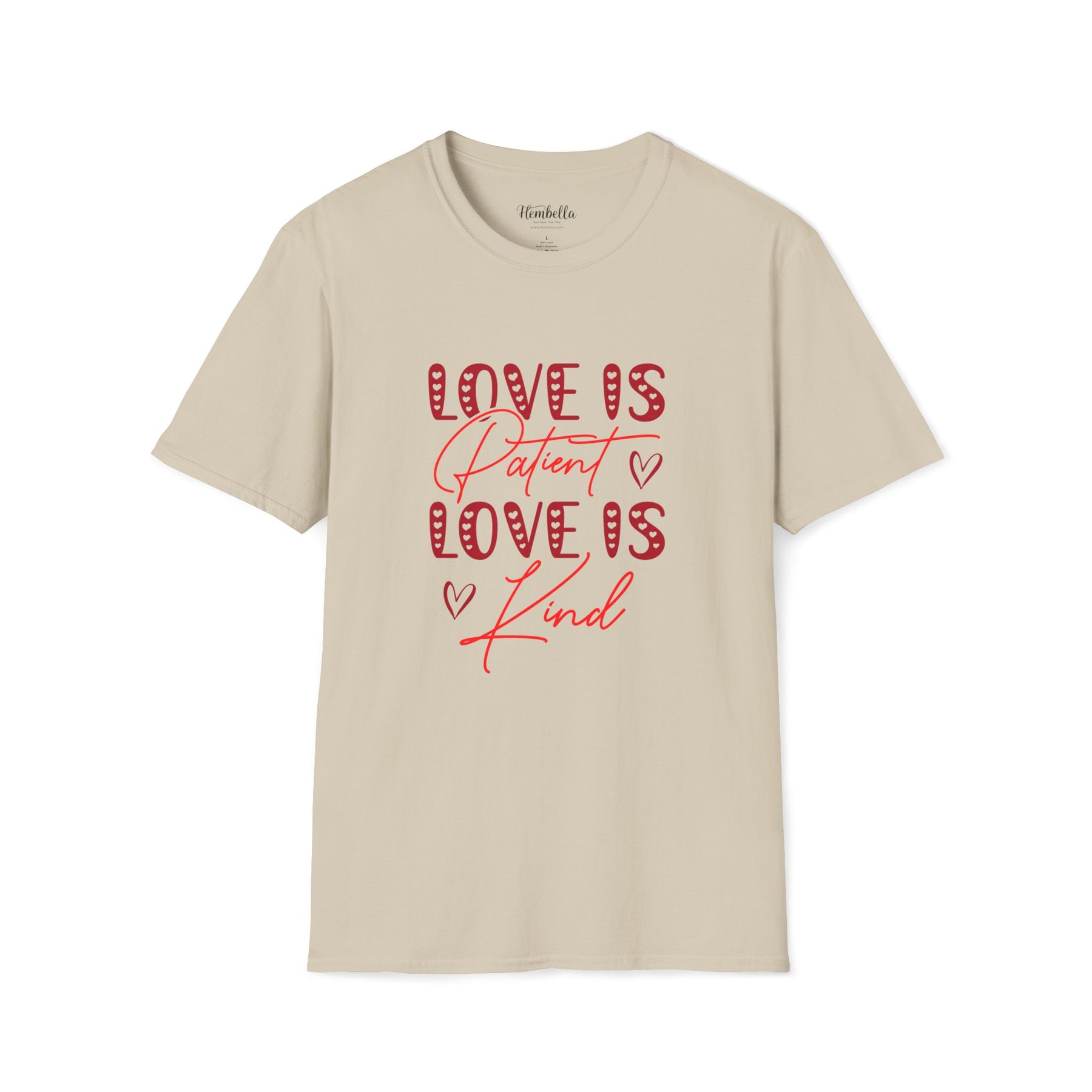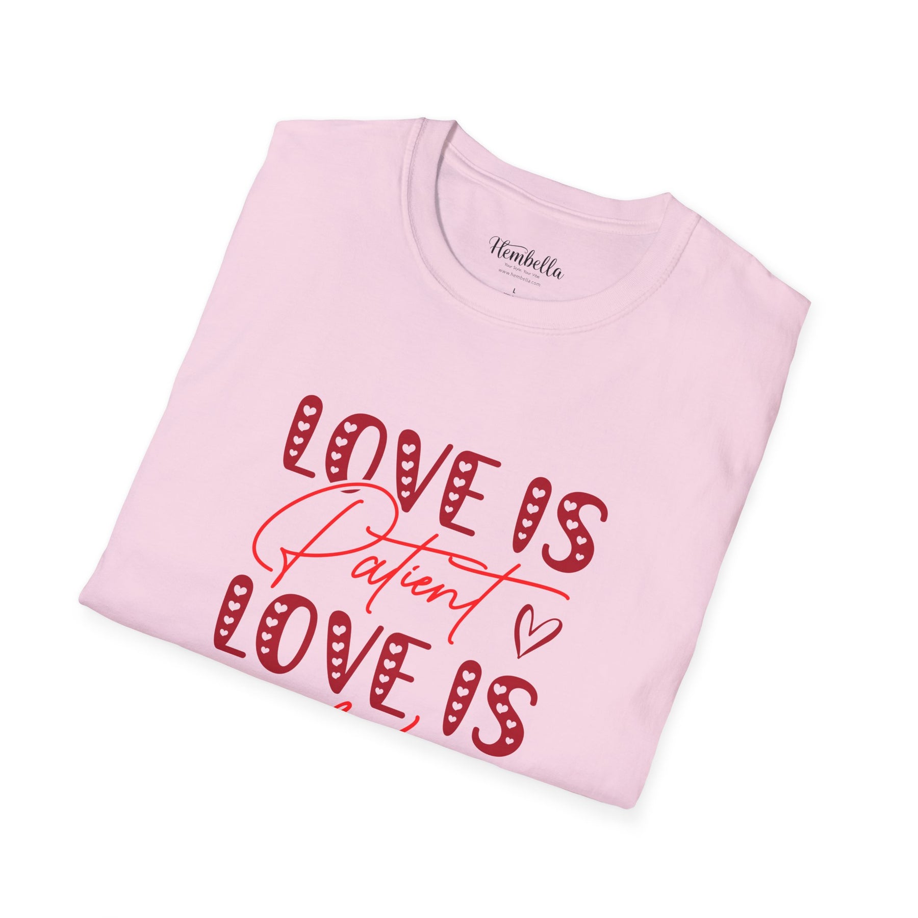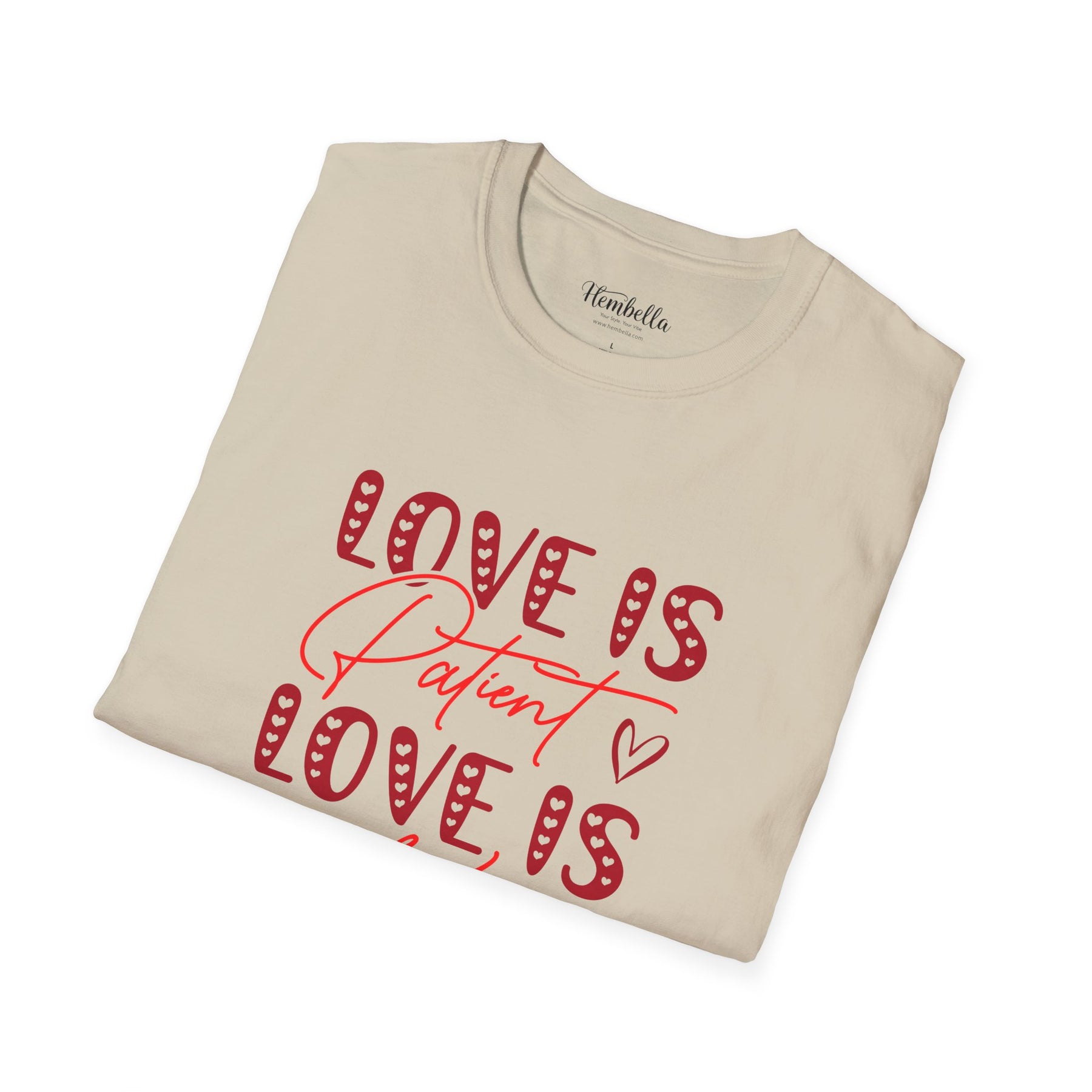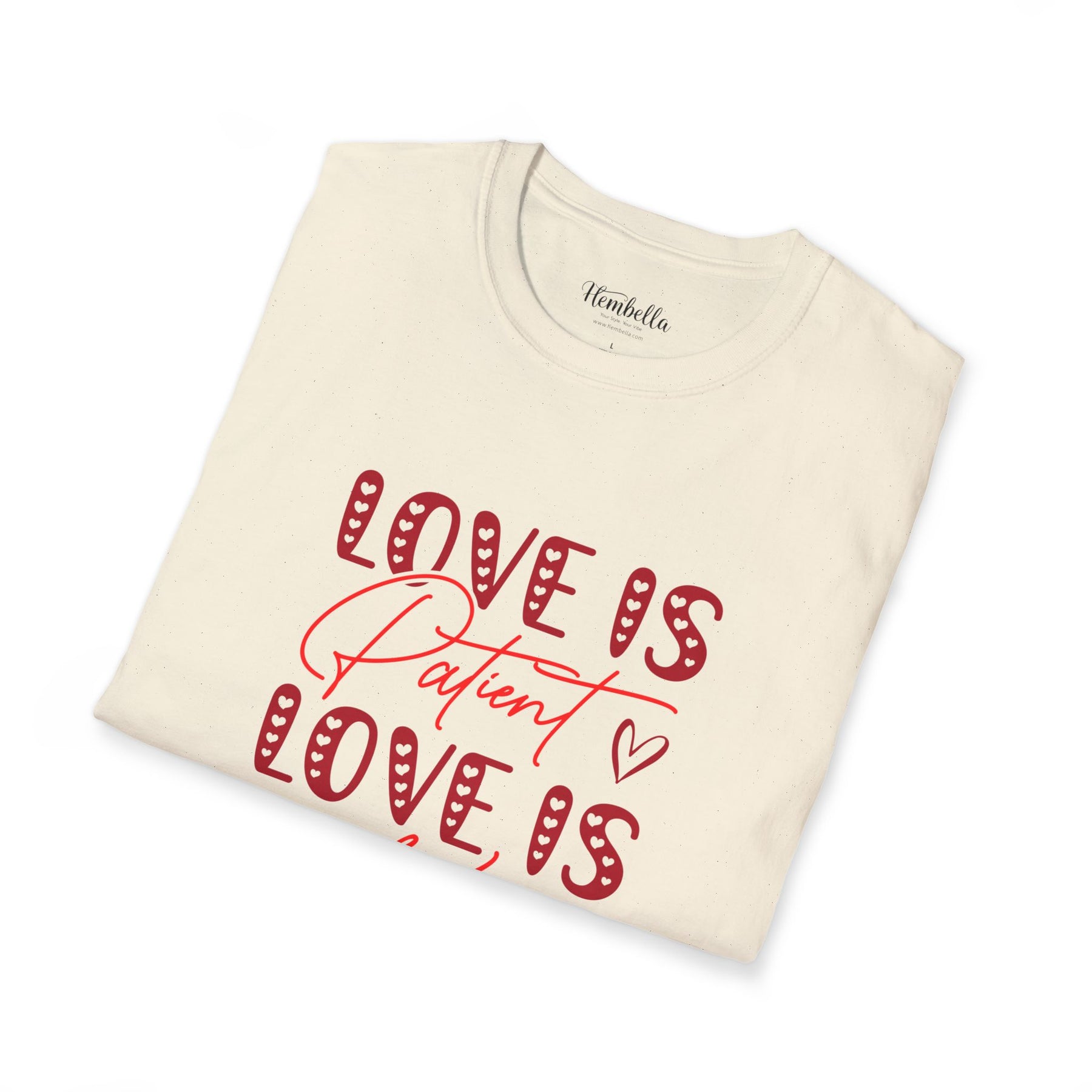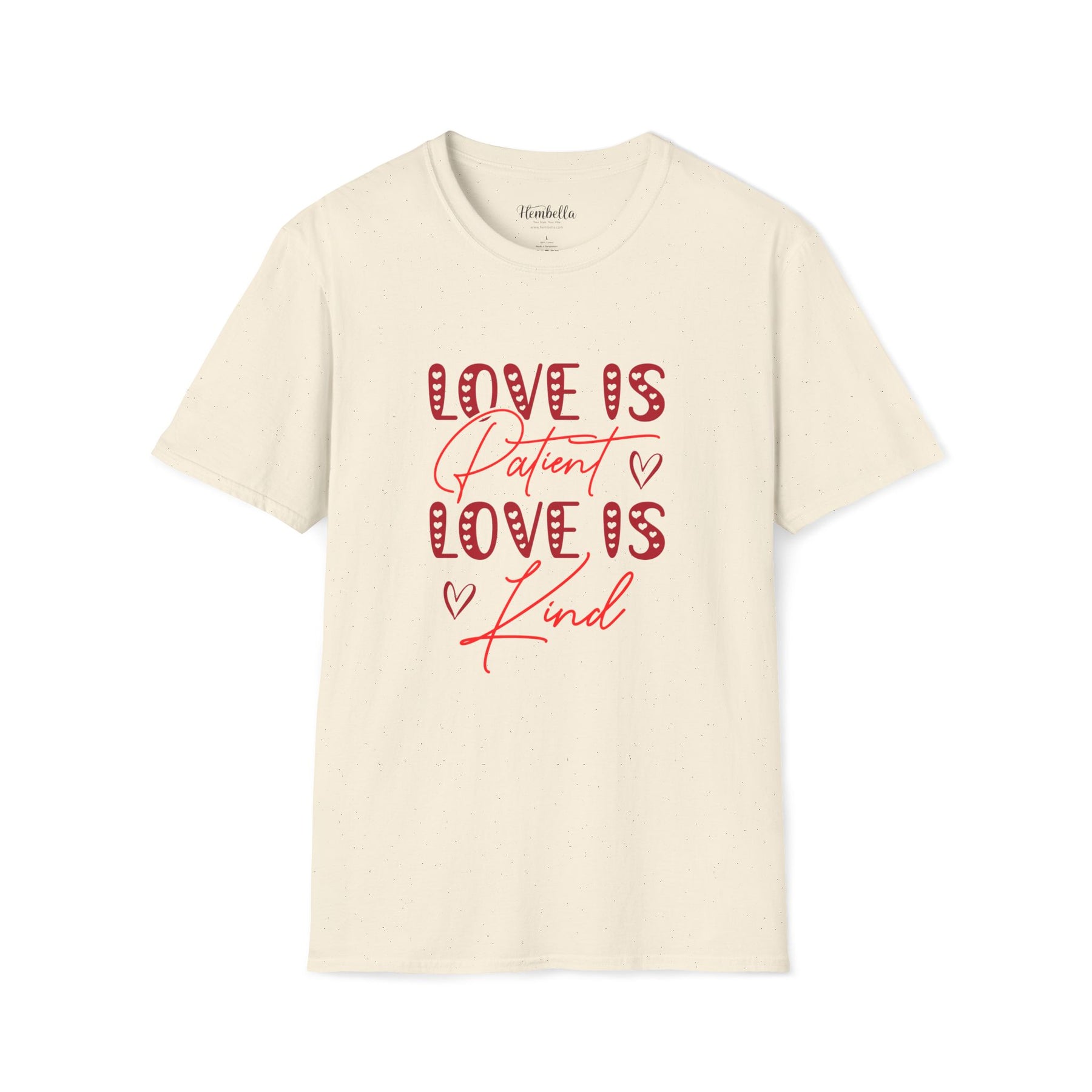 Soft, approachable, and quietly joyful — this lightweight tee wears like a warm conversation. The front art layers playful, candy-striped block letters with flowing script that reads “Love is Patient / Love is Kind,” accented by tiny hand-drawn hearts. It settles close to the body without clinging, offering a clean crew neckline and smooth, durable fabric that takes prints beautifully. Wear it to slow morning coffees, church gatherings, volunteer days, or casual date night walks; it adds a gentle, hopeful note to everyday moments and conversations about what matters most.