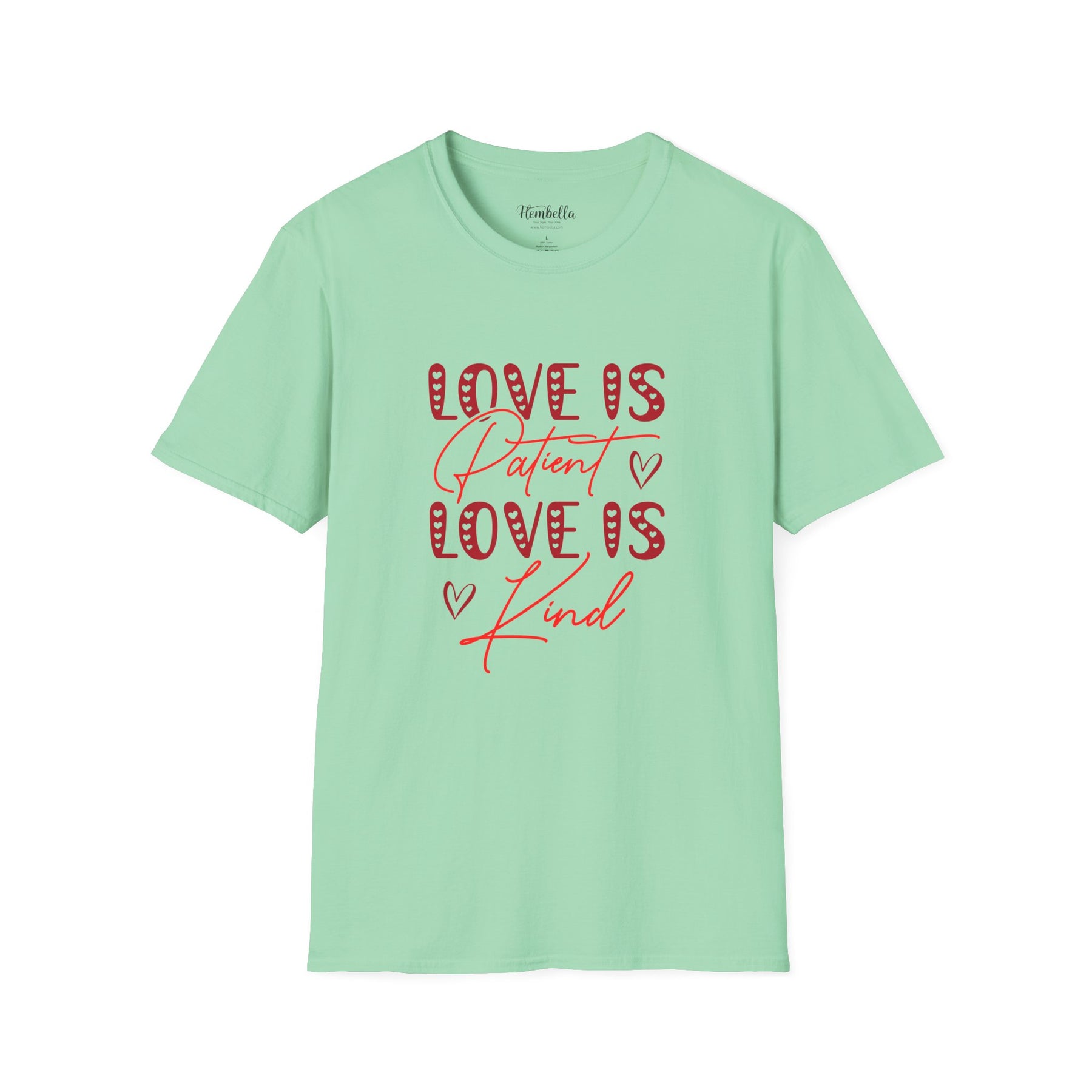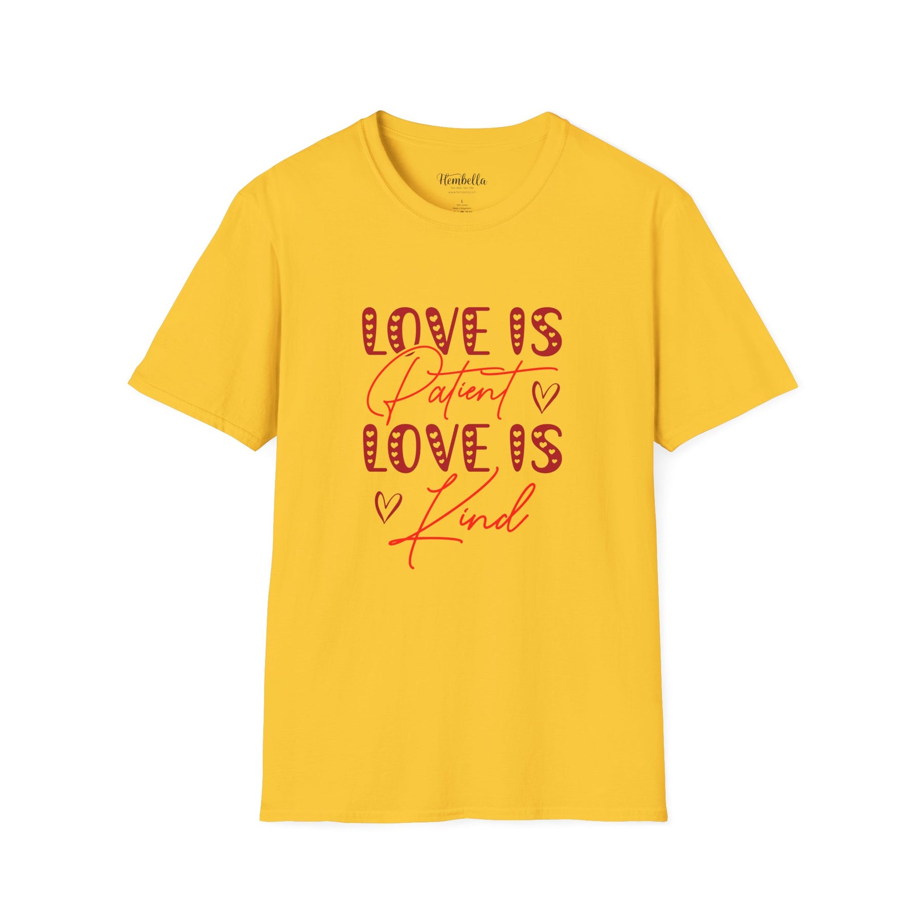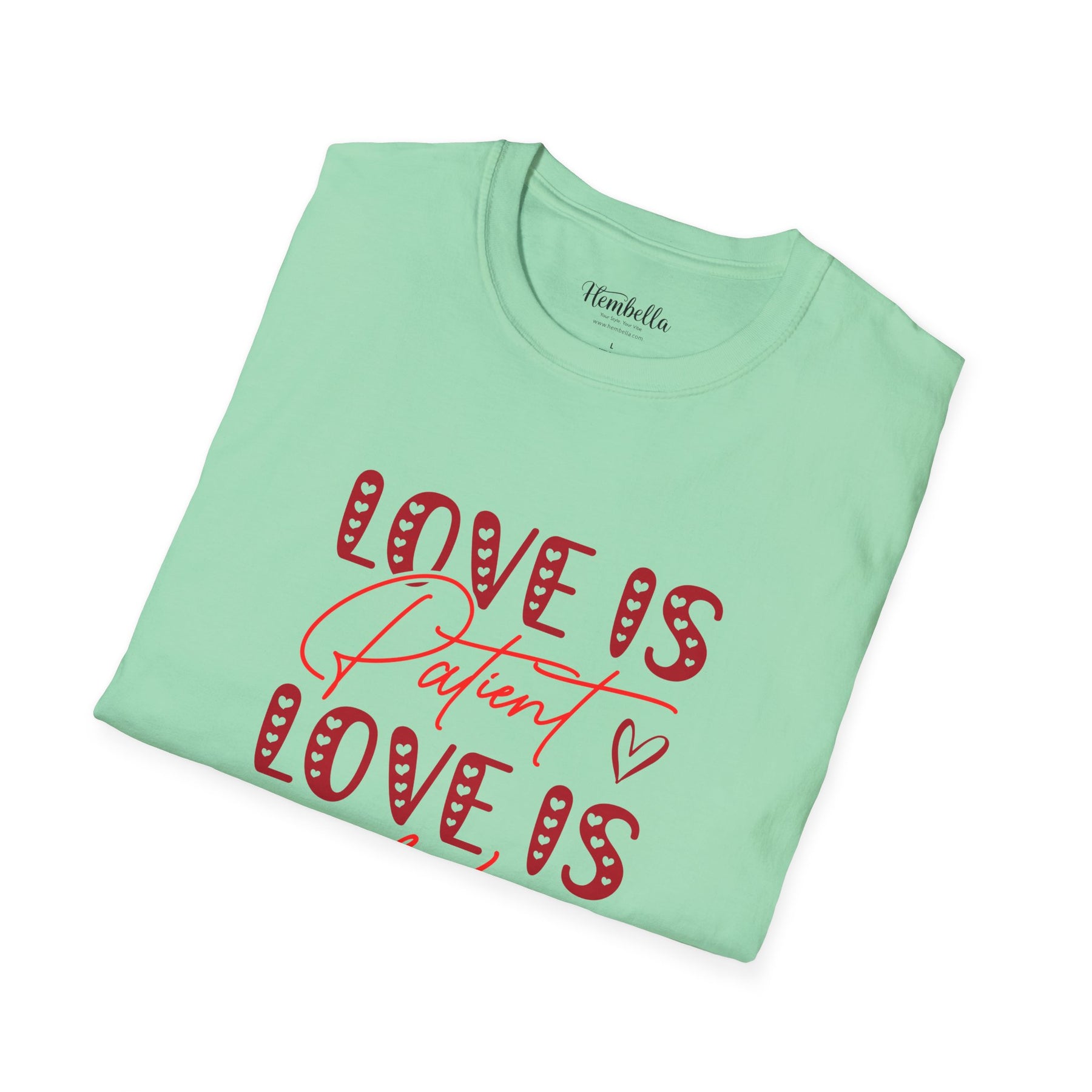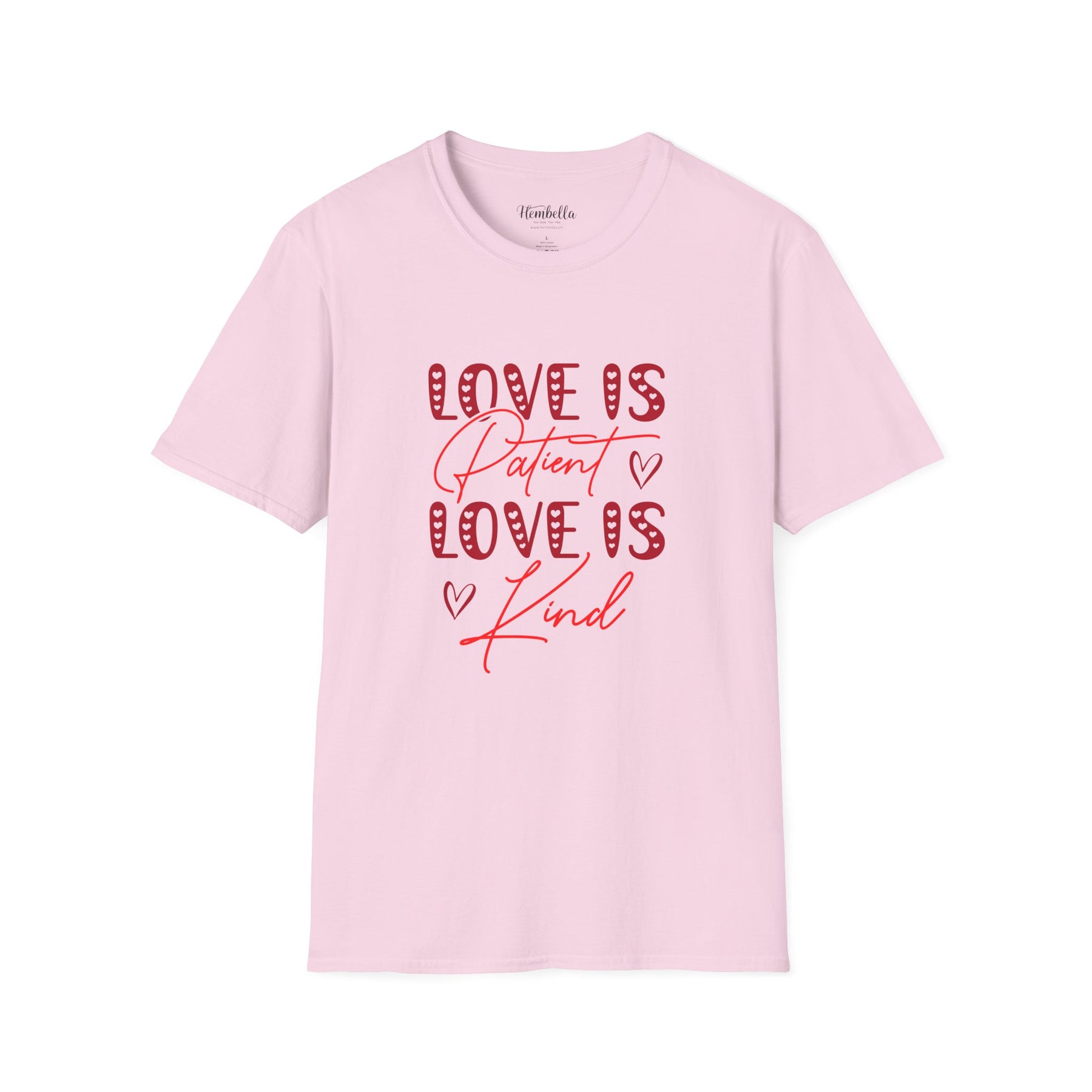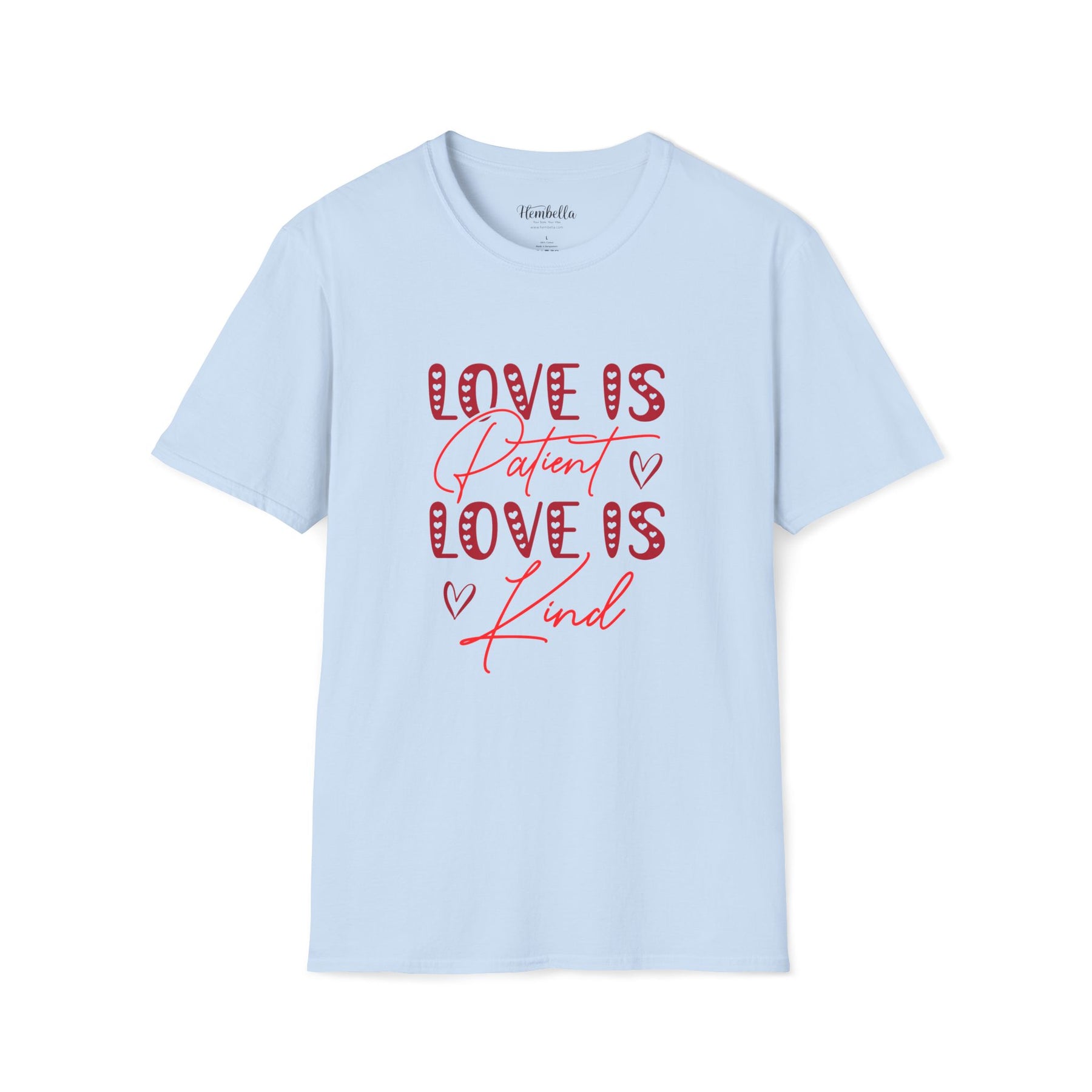 Soft, approachable, and quietly joyful — this lightweight tee wears like a warm conversation. The front art layers playful, candy-striped block letters with flowing script that reads “Love is Patient / Love is Kind,” accented by tiny hand-drawn hearts. It settles close to the body without clinging, offering a clean crew neckline and smooth, durable fabric that takes prints beautifully. Wear it to slow morning coffees, church gatherings, volunteer days, or casual date night walks; it adds a gentle, hopeful note to everyday moments and conversations about what matters most.